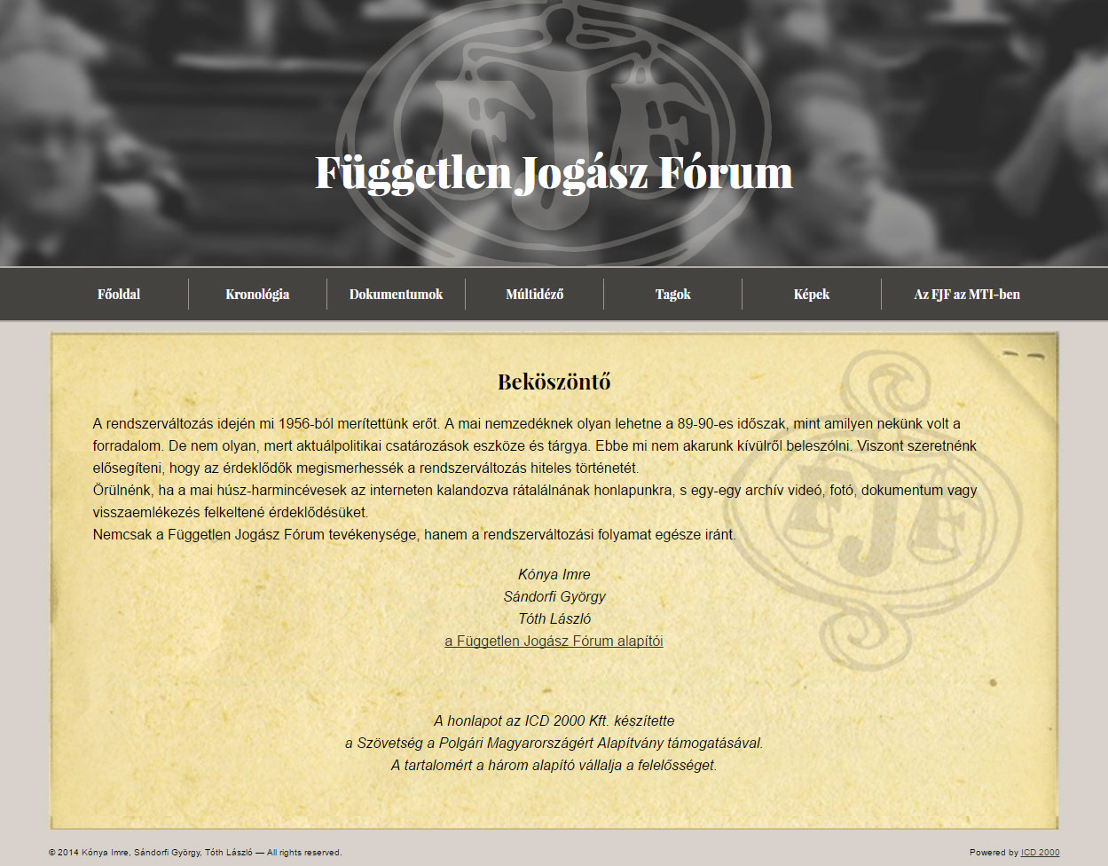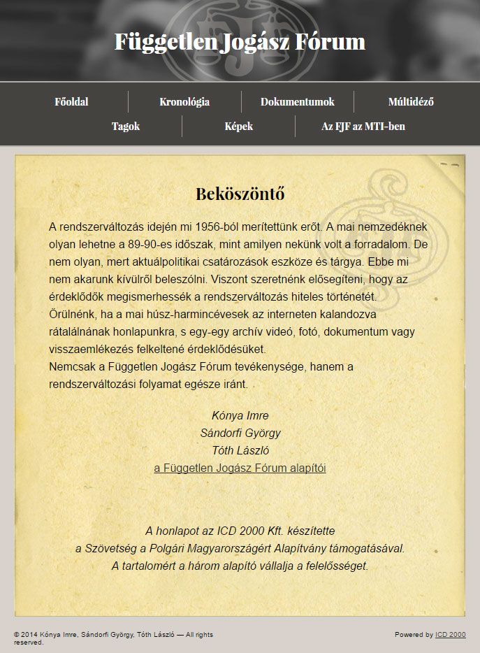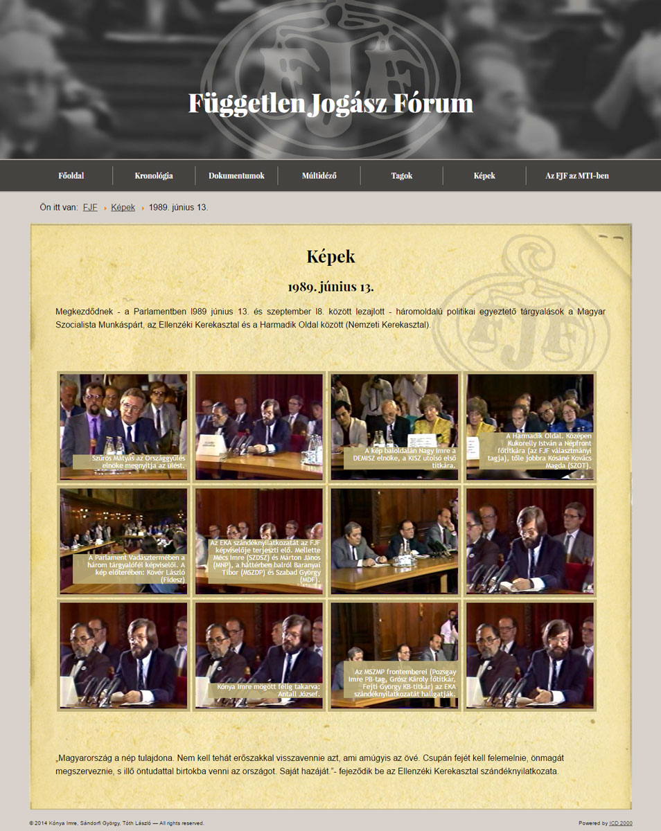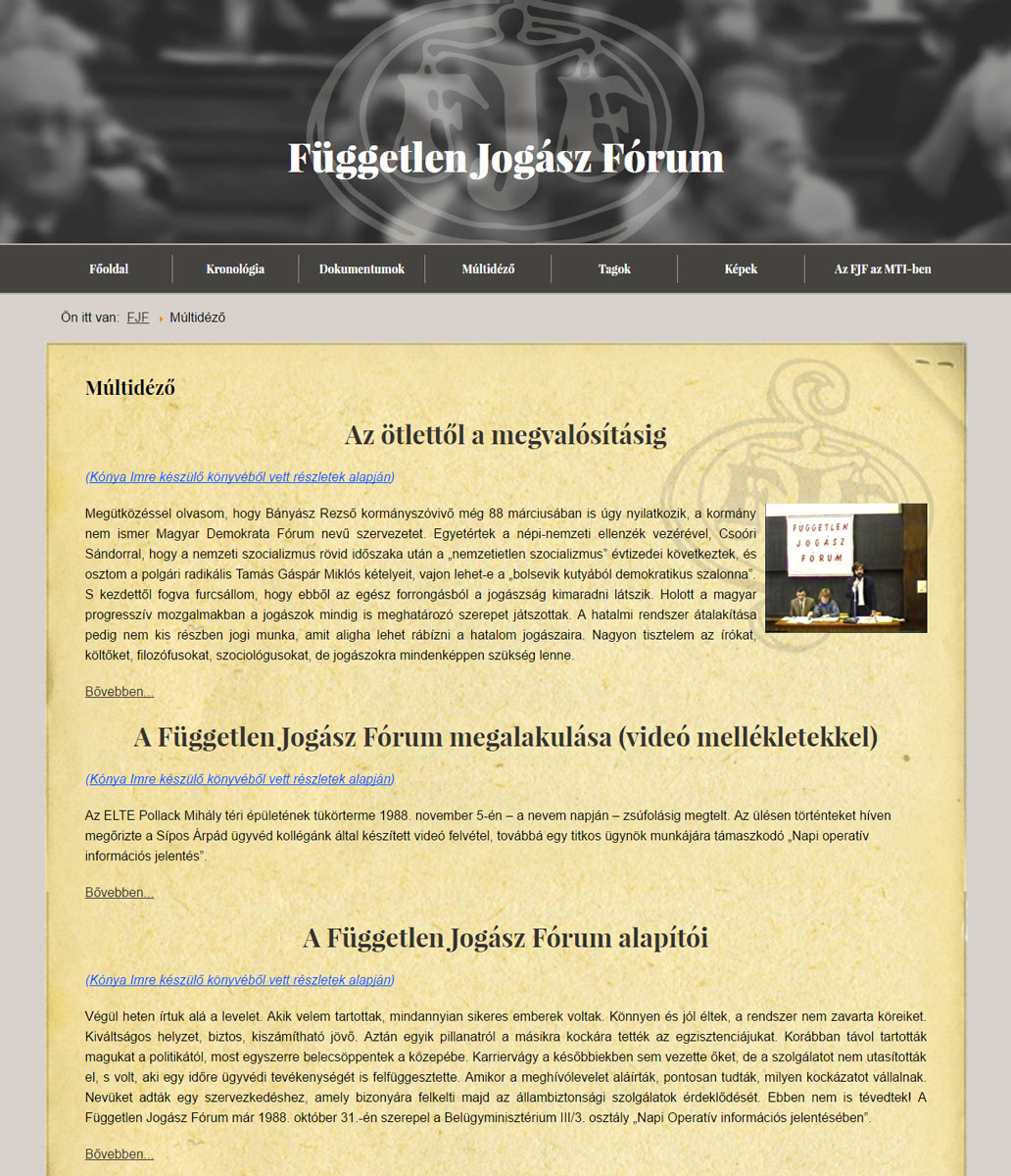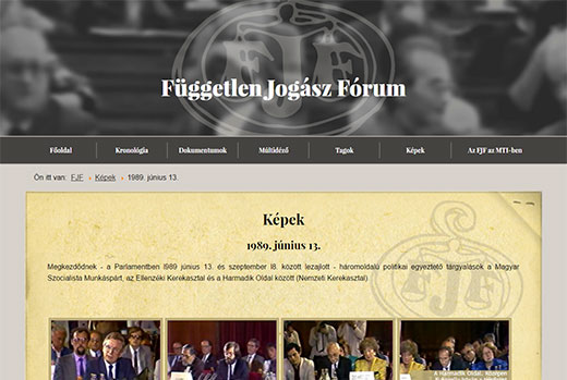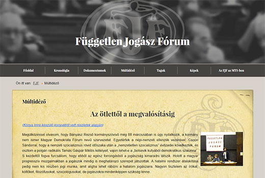 A Magyar rendszerváltásban kiemelkedő szerepet játszó Független Jogász Fórum 1988 és 90 közötti tevékenységét dokumentáló emlékoldal.
